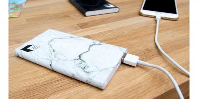 Con questa batteria portatile dal design in marmo bianco, potete caricare costantemente il vostro cellulare con stile.